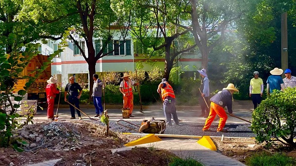 合作共赢,细致升级“新路径” 改造不是“一言堂”促成的,需要“四驾马车”和全体居民齐头并进。在机动车辆管理收费标准调整和项目改造升级初期,党总支、业委会多次组织业主代表大会,上门征询意见,通过书面表格和改造效果图向业主详细解释收费标准调整和改造升级的细节以及改变后能带来的益处,对有疑问的居民及时做好解释工作。同时在社区云、社区通、宣传栏等同步公开结果,做到改造全过程公开透明。  施工中 在推进过程中,不时有居民来居委会提出自己的宝贵想法和建议,居委会的同志们都会认真记录在案,在工程例会上主动汇报,商议建议的可行性。在改造过程中,居民或撑伞驻足,或默默关注着施工进展。