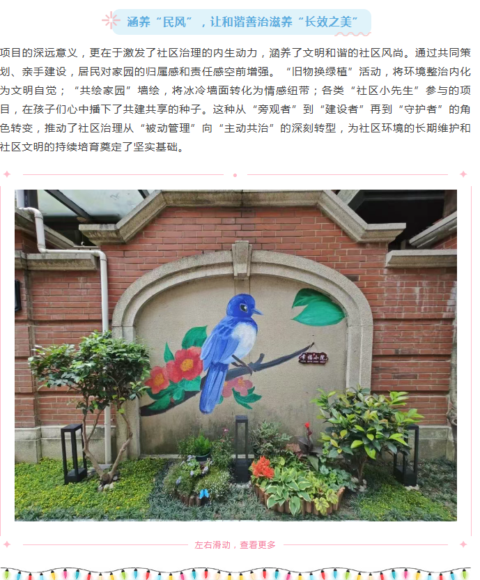 从一面墙的彩绘,到一个角落的花园,再到一片区域的焕新,“美丽更可见,人民出主意”的实践深刻揭示——社区治理的密码,就掌握在居民手中。党建的引领作用,关键在于搭建平台、畅通渠道、凝聚共识,将人民的智慧与热情转化为改造家园的磅礴力量。当每一位居民都能成为社区美的“设计师”“施工员”和“维护者”,家园的“美丽”便拥有了最深厚的根基与最持久的生命力。这幅由党组织引领、以民智为笔、共绘而成的杨行社区美丽新图景,必将更加绚丽多彩,持续奏响宜居、和谐、幸福的社区生活新乐章。