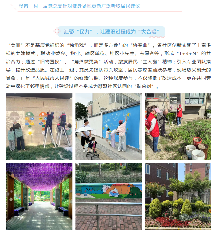 一句句朴素的居民心声,并非简单的抱怨,而是社区治理最宝贵的“金点子”,更是党建引领下共建美好家园的生动起点。2025年,杨行镇以“美丽更可见,人民出主意”为导向的系列社区党建项目蓬勃开展,各居民区党组织积极搭建平台、创新机制,将居民的“好主意”转化为社区的“新风景”,成功探索出一条“党建引领、多元共治、成果共享”的社区治理新路径,让美丽的家园蜕变成真正可观、可感、可及。