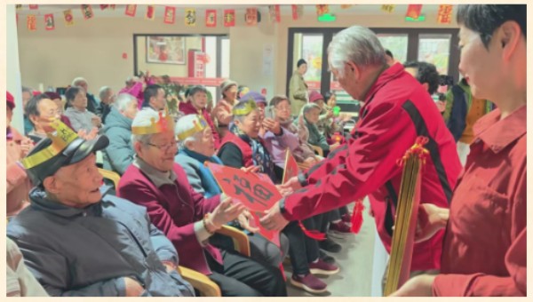 联欢伊始,一曲欢快的生日祝福歌,为20余位当月生日的长者庆生,热情洋溢的贺词、精致甜美的蛋糕,特别是侨眷书法家将心意凝于笔端,向寿星赠送了挥毫书写的“福”字挂件,现场的祝福掌声在多功能厅回响。紧接着,侨界志愿者们与住养长者、员工轮番登场,与长者们一起通过戏曲、舞蹈、朗诵,鼓声、乐声、歌声等文艺表演,精彩纷呈,温情叩响马年新春的门扉。
