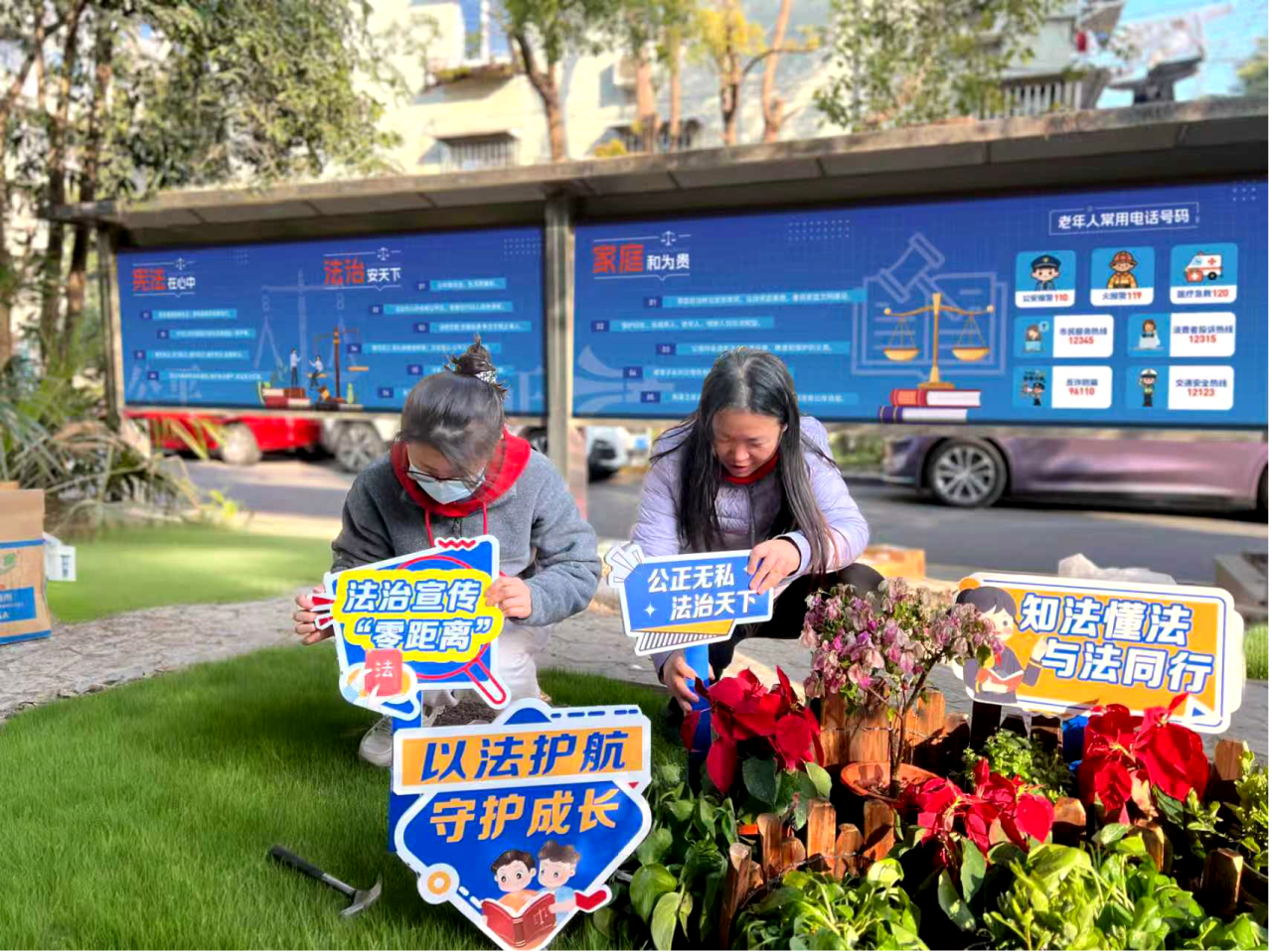 居民区通过搭建议事平台,汇集居民“金点子”,改造目光投向法苑亭北侧一片杂草丛生的闲置绿地。一场从“封闭亭”到“开放苑”的“微手术”就此展开:清杂草、优绿化、铺步道、添语录牌……未来,这里不仅是纠纷调解的驿站,更是“社区居民法治论坛”、“读法沙龙”的天然课堂,学法、聊法、议事的“法治文化客厅”。 家园之美,因居民参与而更有温度。改造过程中,居民区积极动员“社区小先生”家庭、党员志愿者及热心居民,共同参与空间的布置、美化与维护。在携手劳作的志愿同行中,居民对空间的归属感与责任感油然而生。一草一木、一砖一石,都凝结着共同的情感与付出,真正成为人人珍惜、人人享有的共同体家园。