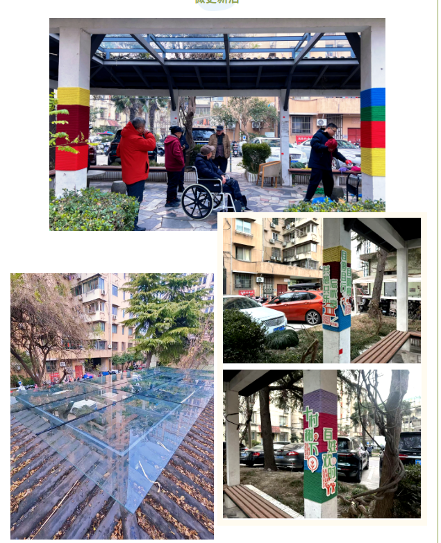 高境镇深入践行“人民城市”理念,始终坚持党建引领为核心,以“一居一品”项目为引擎,启动一批“社区微更新”改造,聚焦民生“关键小事”,推动公共空间焕新与居民自治能力双提升。通过持续优化公共服务供给,形成了“以点带面、品牌辐射”的良性循环,让沉睡的社区资源重新“活”起来。经过前期申报、实地调研等流程,一批微更新项目已在各个社区落地生花。 让我们一起走进共和十村和三花现代城第二居民区,看一个社区自治服务品牌如何驱动唤醒社区角落,让家园越变越好。 共和十村常住人口1800余人,老年人占比高,拥有共治共建特色,但社区资源匮乏、小区老旧是最大痛点。社区以“十村树下”为社区自治服务品牌,用一棵树撑起老年居民的“幸福屋檐”,探索出一条老旧小区微更新的温情路径。 在共和十村,大树旁的凉亭是居民们经常光顾的地方。但因亭顶漏空,遇雨便无法停留,大家只能望亭兴叹。“晴天还好,一到雨天,雨水直直地落进来”“我们老年人多,就想有个地方坐着聊聊天”……在一次次走访和一场场意见征询中,社区党组织把“话筒”递给居民,把这些朴素的“微心愿”一一收进笔记本。党总支将这些朴素心愿作为项目启动的“第一信号”,决定就从这棵树、这座亭、这片树下空间开始改,让居民的需求真正成为行动的起点。 凉亭的顶换成了玻璃透光顶,阳光洒下来,暖洋洋的,雨天也再不用躲。柱子上缠上了彩色绒线,红的、黄的、绿的,像给老社区穿上了一件新毛衣。树下多了一块块温馨的标语牌,字不多,却让人看了心头一暖。