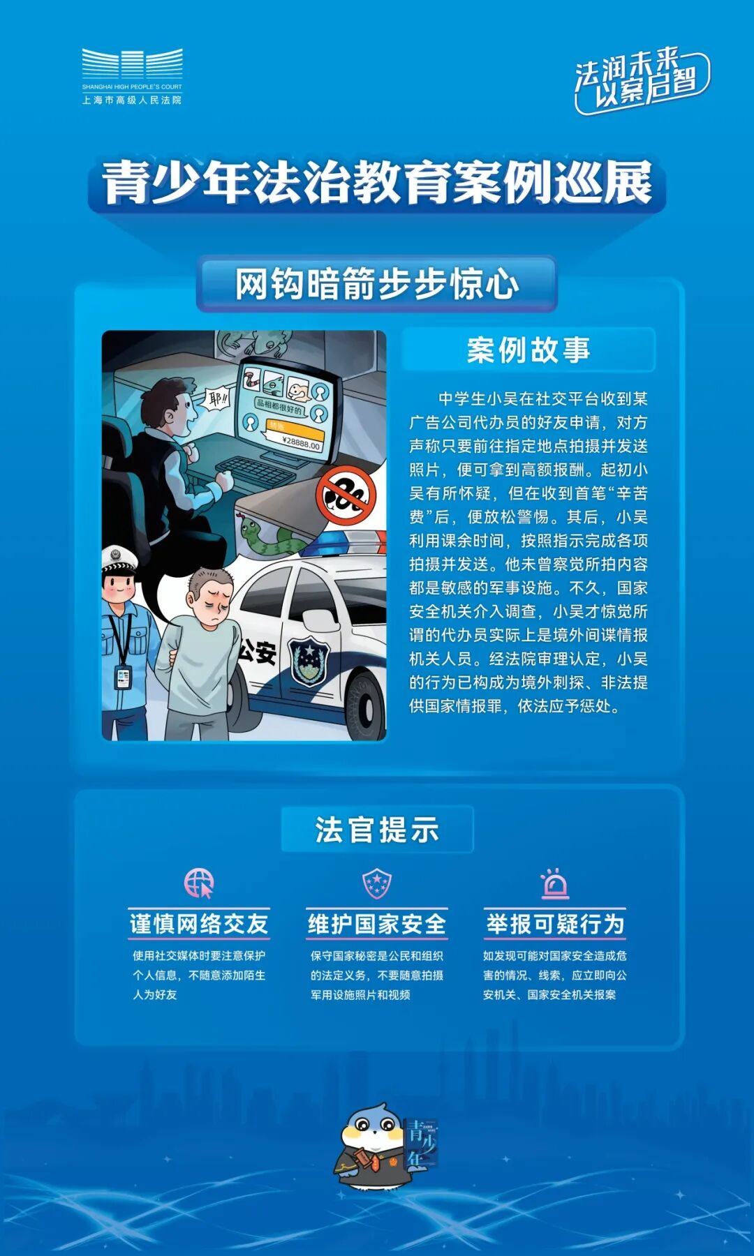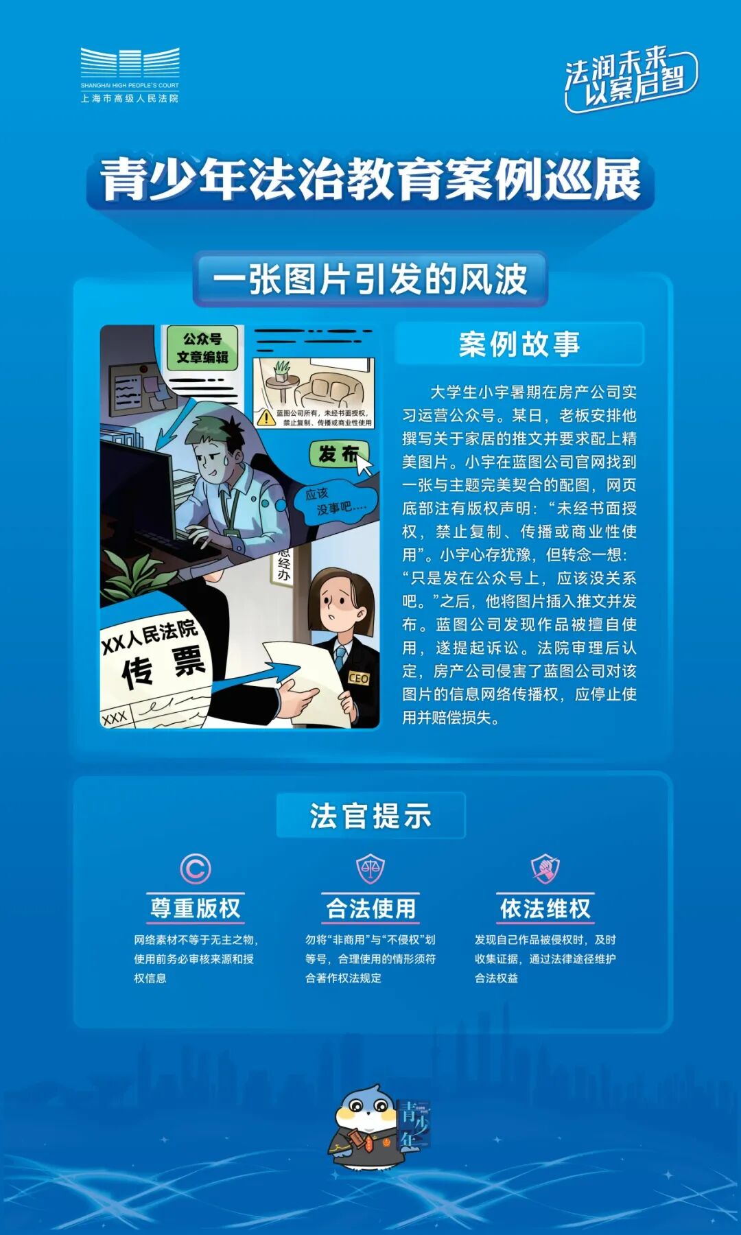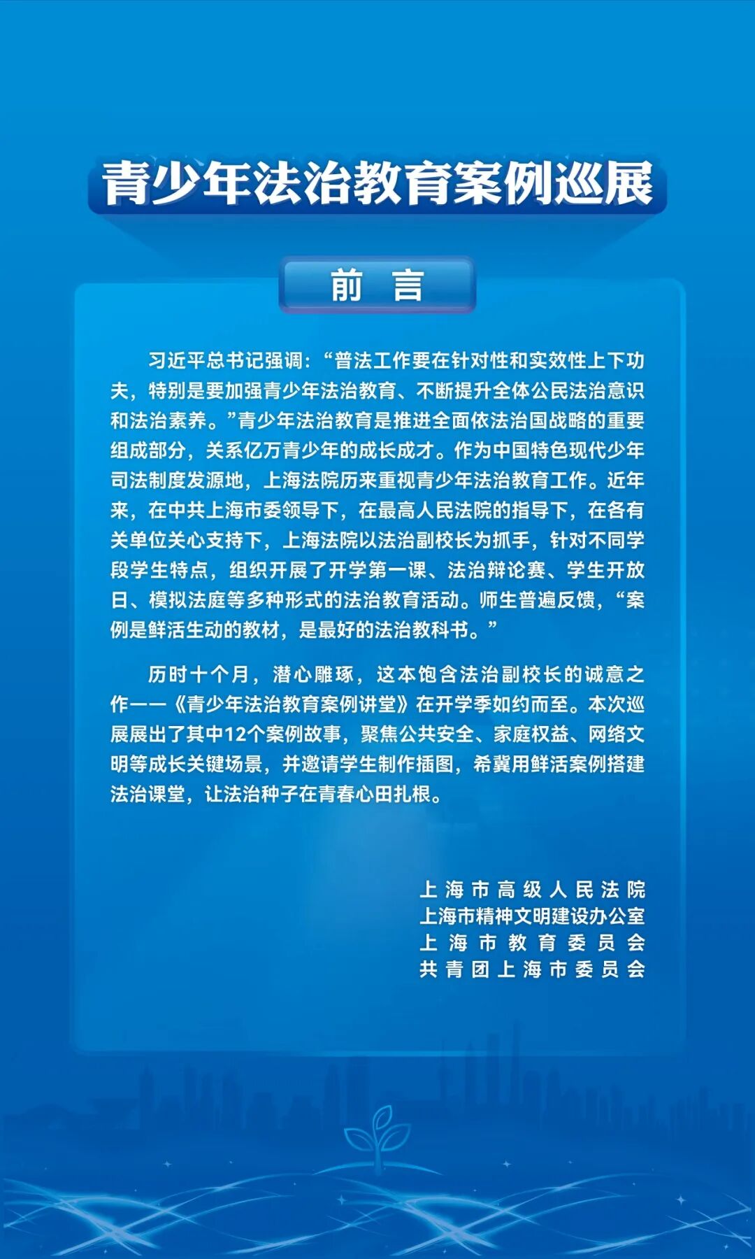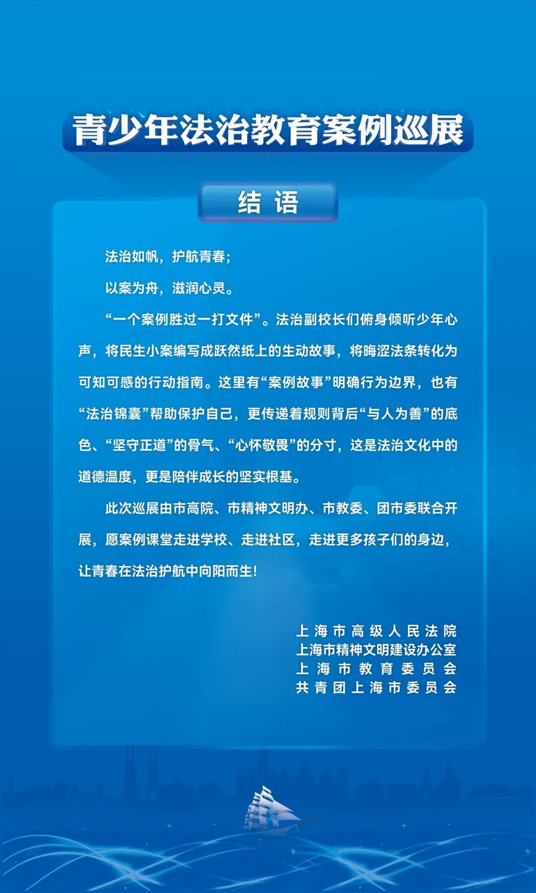 又是一年开学季,市高院、市精神文明办等单位,充分发挥“身边事、民生案”的教育功能,精选青少年法治教育案例,设计鲜活生动的案例故事海报,在全市范围开展青少年法治教育案例巡展活动。 海报电子版可登录文明上海网(www.shwm.gov.cn)首页“公告”栏目下载。
