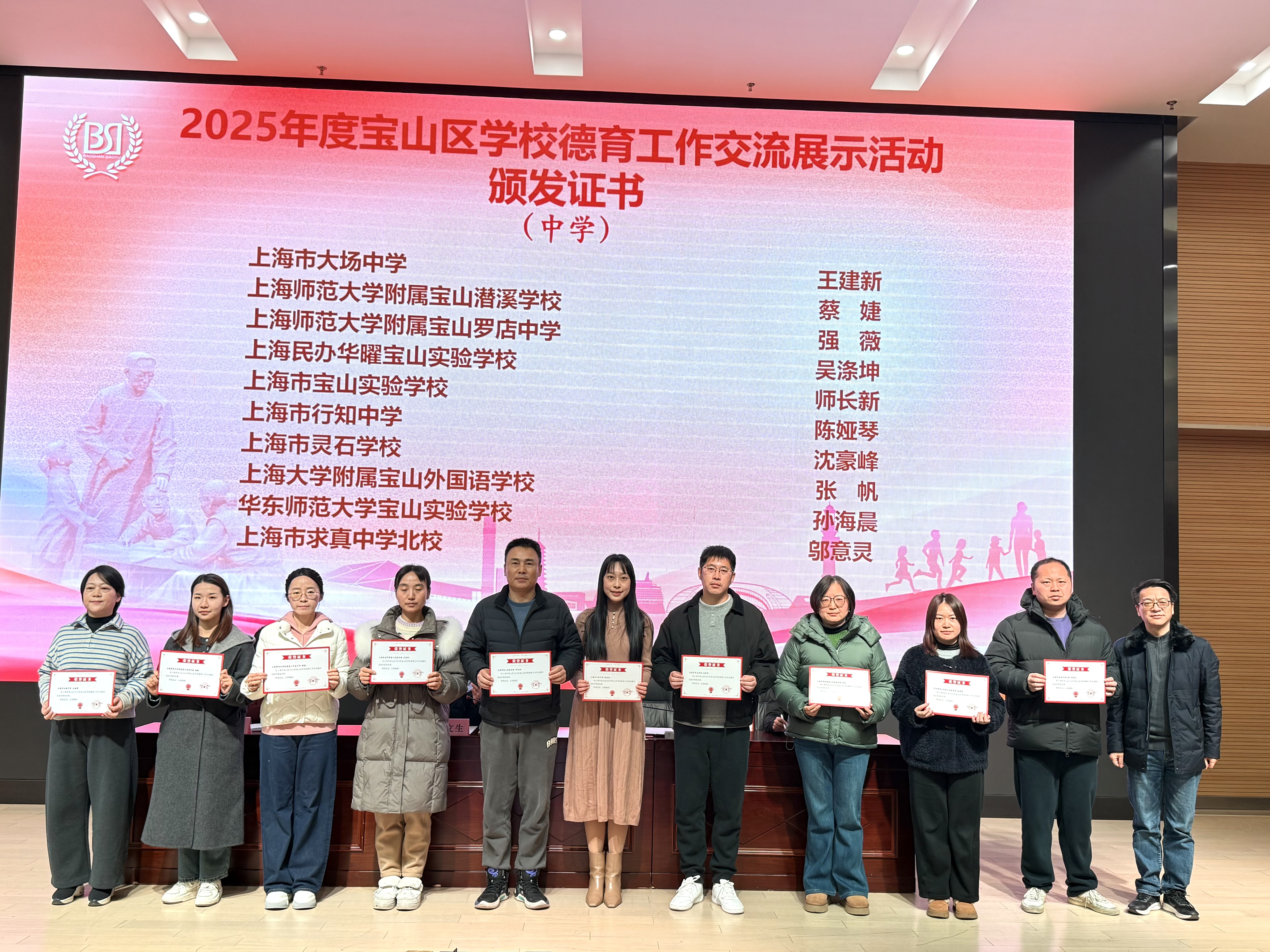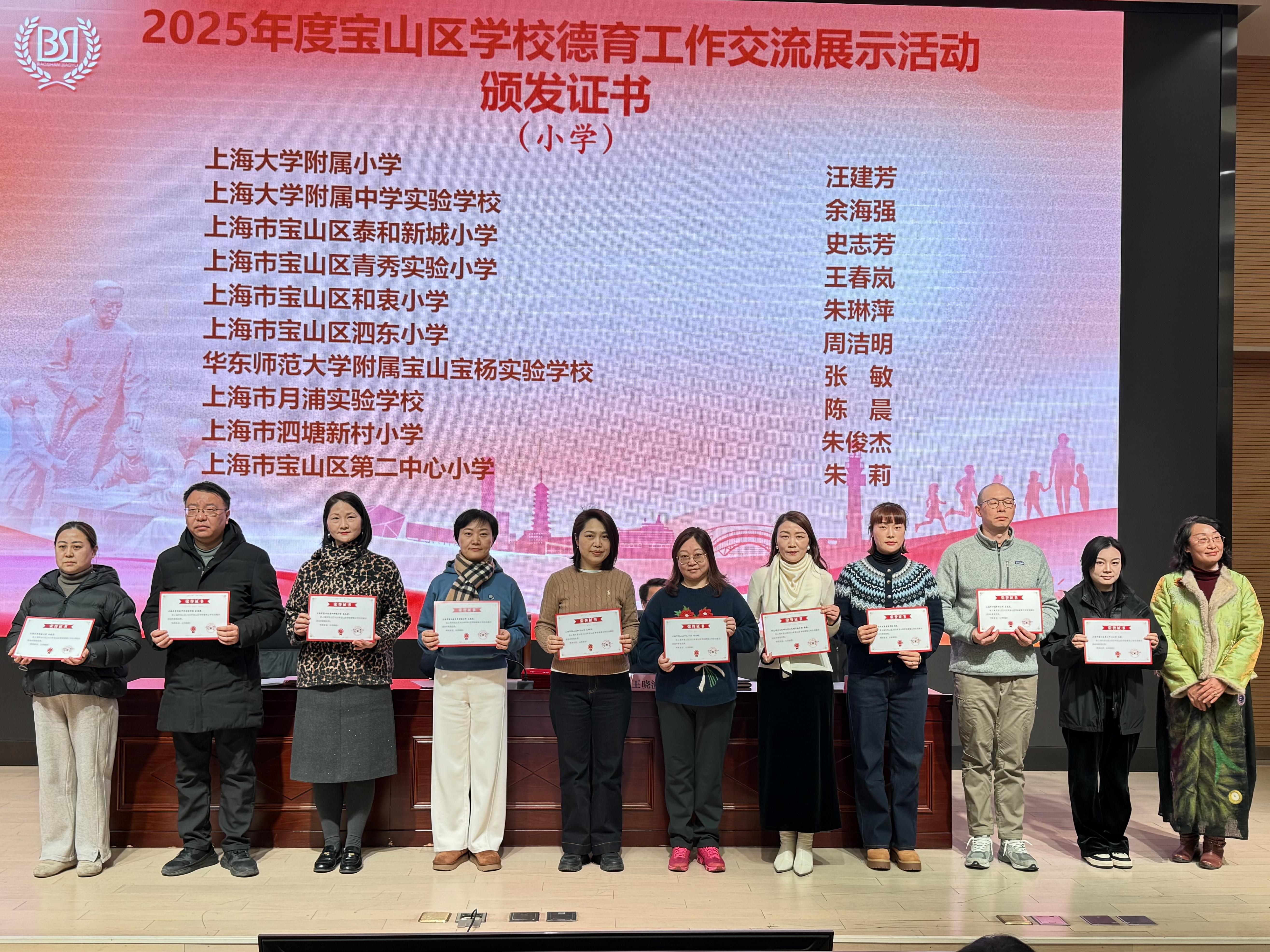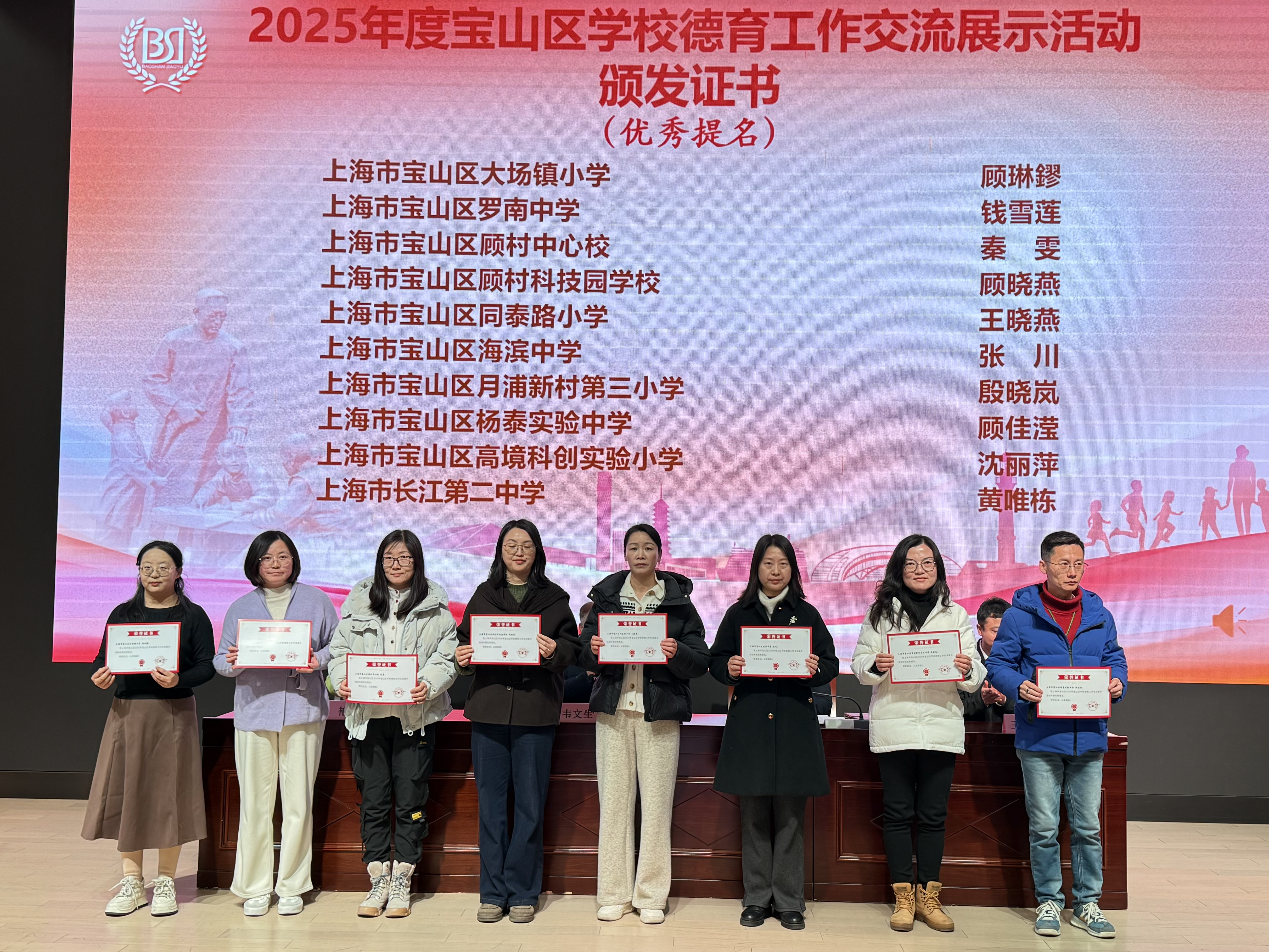 区妇联副主席杨艳、区教育局副局长王晓波为2025年度宝山区学校德育工作交流展示活动表现优秀的老师颁发证书