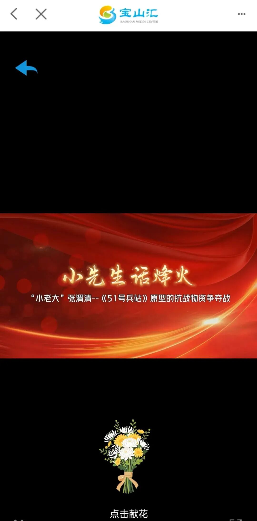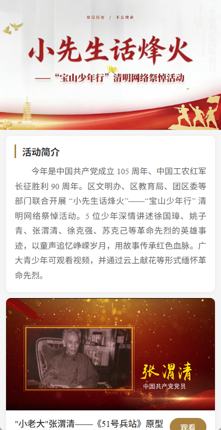 3月28日以来,全区已同步开展“小先生话烽火”网络祭悼活动。5位少年深情讲述徐国璋、姚子青、张渭清、徐克强、苏克己等革命先烈的英雄事迹,以童声追忆峥嵘岁月,用故事传承红色血脉。广大青少年可登陆“宝山汇”APP观看视频,并通过云上献花等形式缅怀革命先烈。