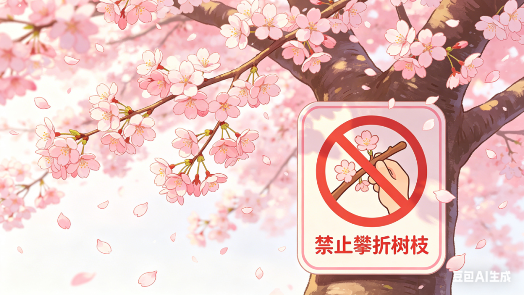 春光短暂,文明相伴。我们向市民朋友们倡议: 1.不攀爬树木、不摇晃树枝制造“花雨”、不攀折花枝 2.不踩踏草坪、不进入非开放区域拍照 3.拍照留影时,与花木保持“一臂温柔距离” 4.遇见不文明赏花行为,友善提醒、共同守护 5.自觉带走垃圾,将整洁与美好留给下一位游客