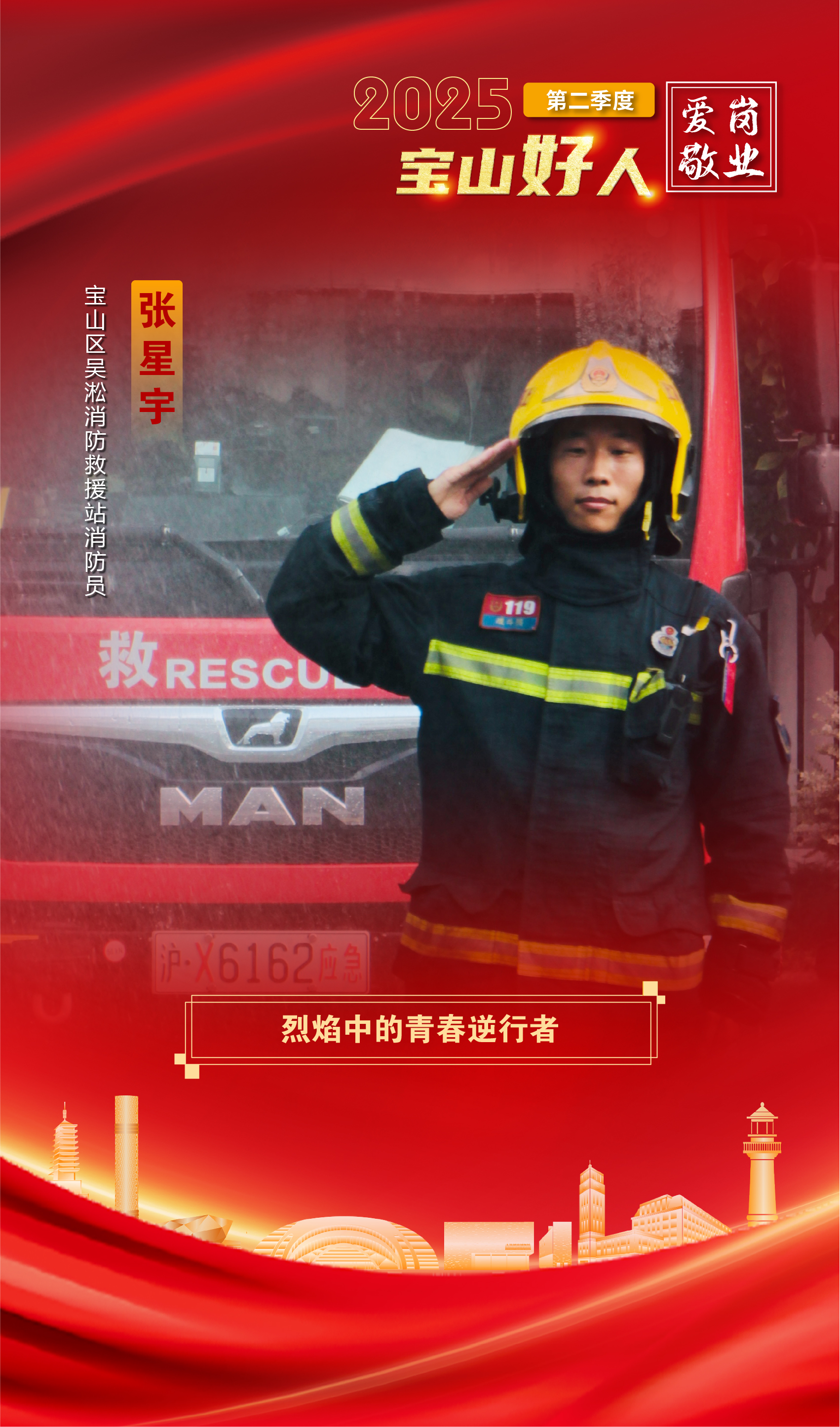 张星宇,男,2000年生,宝山区吴淞消防救援站消防员。6月28日晚21时,宝山区淞南镇淞湾路390弄(柏悦江湾)发生一起居民火灾,吴淞消防救援站接警后第一时间出动。到达现场后,整栋房屋已处于全面燃烧,滚滚浓烟从窗口翻卷而出。为搜救被困人员,及时扑灭火灾,张星宇作为第一内攻小组,佩戴好个人防护装备后,与2名队友扛着水枪内攻进入着火建筑。房屋内部烟雾重、温度高、可见度低,张星宇作为水枪手,不惧高温烈火,一直冲锋在前,战斗在最前面。经过张星宇和队友们的奋力扑救,火灾得到及时控制,无人员伤亡。但因室内电梯井玻璃受到高温后破碎,张星宇在灭火中坠入电梯井,身受重伤(腰椎骨折、臀部以下烫伤,目前正在长征医院接收治疗)。 张星宇同志是一名00后的消防员,加入宝山区消防救援队伍5年来,累计参与处置1500余起灭火救援任务。尤其是在此次火灾扑救中,不顾个人安危,第一时间内攻搜救被困人员、奋力扑救火灾,为保护人民生命财产安全作出了突出贡献。