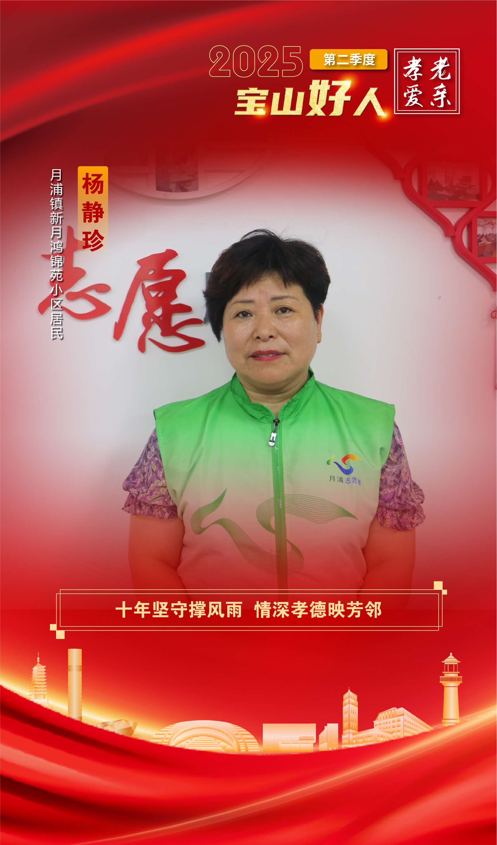 杨静珍,女,1968年生,月浦镇新月鸿锦苑小区居民。十余年来,她以柔弱的身躯毅然撑起风雨飘摇的家庭,书写 “孝老爱亲” 的人间温情。杨静珍1988年嫁入陈家,成为陈家儿媳妇,孝敬公婆,抚育儿子,操持家务,家庭和睦幸福。 2010年婆婆过世,公公也日渐衰老,公公的大女儿因车祸生活无法自理,二女儿幼年夭折,三女儿脑梗失去自理能力,2015年8月,杨静珍丈夫被查出癌症晚期,生活的重担都压在她一个人身上。她倾尽所有,陪着丈夫四处求医问药,进行化疗。然而三个月后,病魔最终还是带走了丈夫。面对重重打击,杨静珍来不及悲痛,还要安慰照顾年迈的公公。每日清晨,她便早起为公公熬制软糯粥食,饭后她扶着老人在小区散步,时时用邻里趣事逗得老人展露笑颜。2024年5月,公公在一次意外摔倒后生活更难自理,需要长期的调养和极为悉心的照料,她立刻在家中布置了各类便老设施,每日按医嘱精心喂药,定时为老人按摩肌肉。十年如一日精心照料,公公面色红润、衣着干净整洁。没有豪言壮语,杨静珍用柴米油盐里的坚守,让“孝老爱亲”从家风化作照亮社区的暖阳,成为居民们纷纷点赞的“身边榜样”。