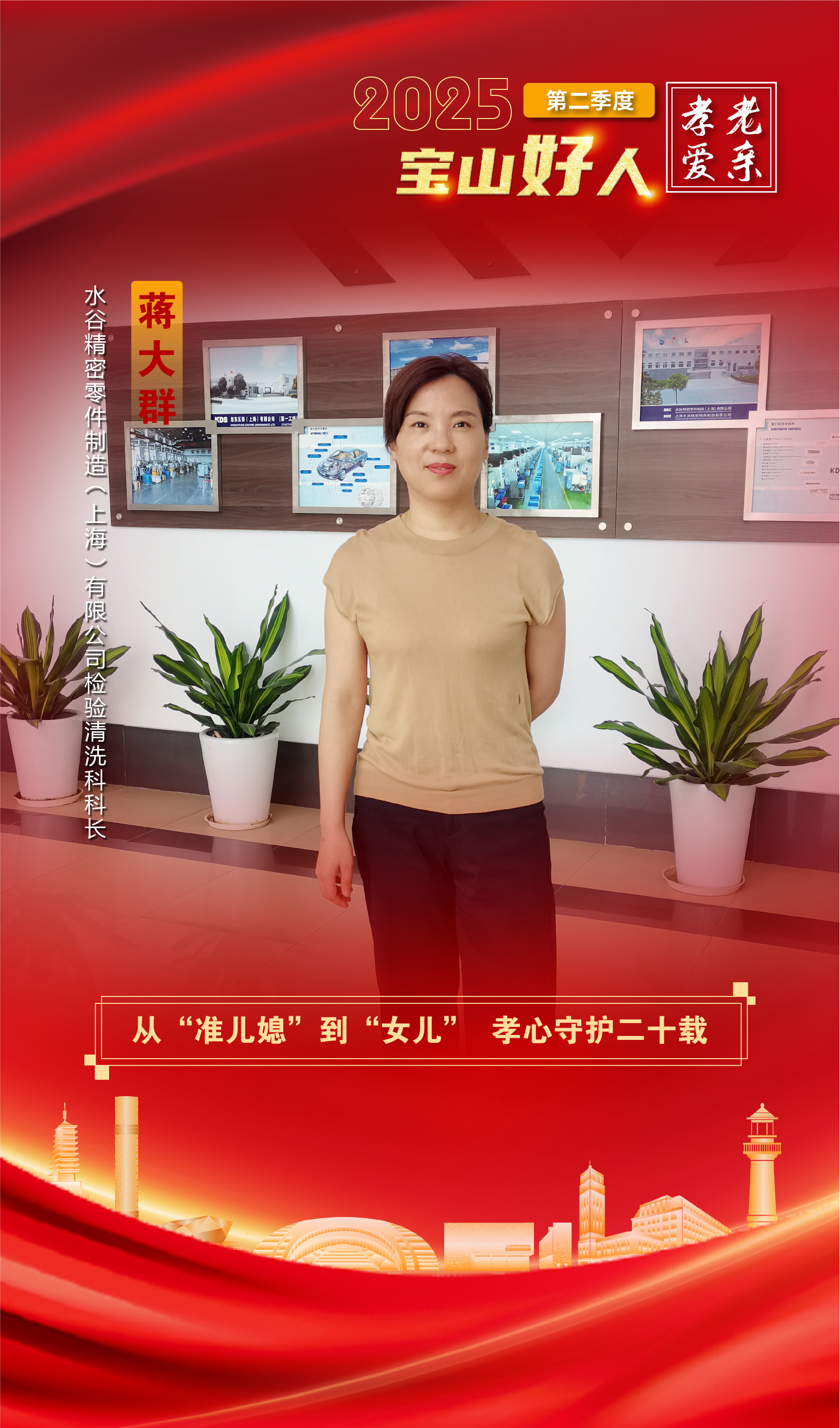 蒋大群,女,1975年6月生,水谷精密零件制造(上海)有限公司检验清洗科科长。1997年,蒋大群未婚夫周先生因车祸去世,他的父母周老太夫妇本就年迈体弱,独生子的意外离世像晴天霹雳几乎把他们击垮。作为未过门的儿媳,善良真挚的蒋大群不忍看到二老孤苦伶仃,毅然挑起了照顾两位老人的重担。 二十多年来,她像亲生女儿一样悉心照料两位老人的生活起居。随着年龄的增长,两位老人身体每况愈下,她主动搬进老人家中,与他们同吃同住,给予全方位的照料。在忙碌的工作之外,她总是挤出时间,全心全意地照顾家中的老人。每天清晨,她总是第一个起床,为老人准备可口的早餐;白天忙完工作,还要回家料理家务、陪伴老人;老人身体不适时,她立即陪同就医,挂号、问诊、取药全程照顾。遇到后来的丈夫后,两人一起承担起照顾老人的责任,用双倍的爱心温暖着这个特殊家庭。在她的悉心照料下,周老太夫妇的精神状态越来越好,逢人便夸:“大群比亲闺女还亲!”二十多年,蒋大群用柔弱的肩膀扛起孝老爱亲的重任,用实际行动温暖着身边的每一个人。