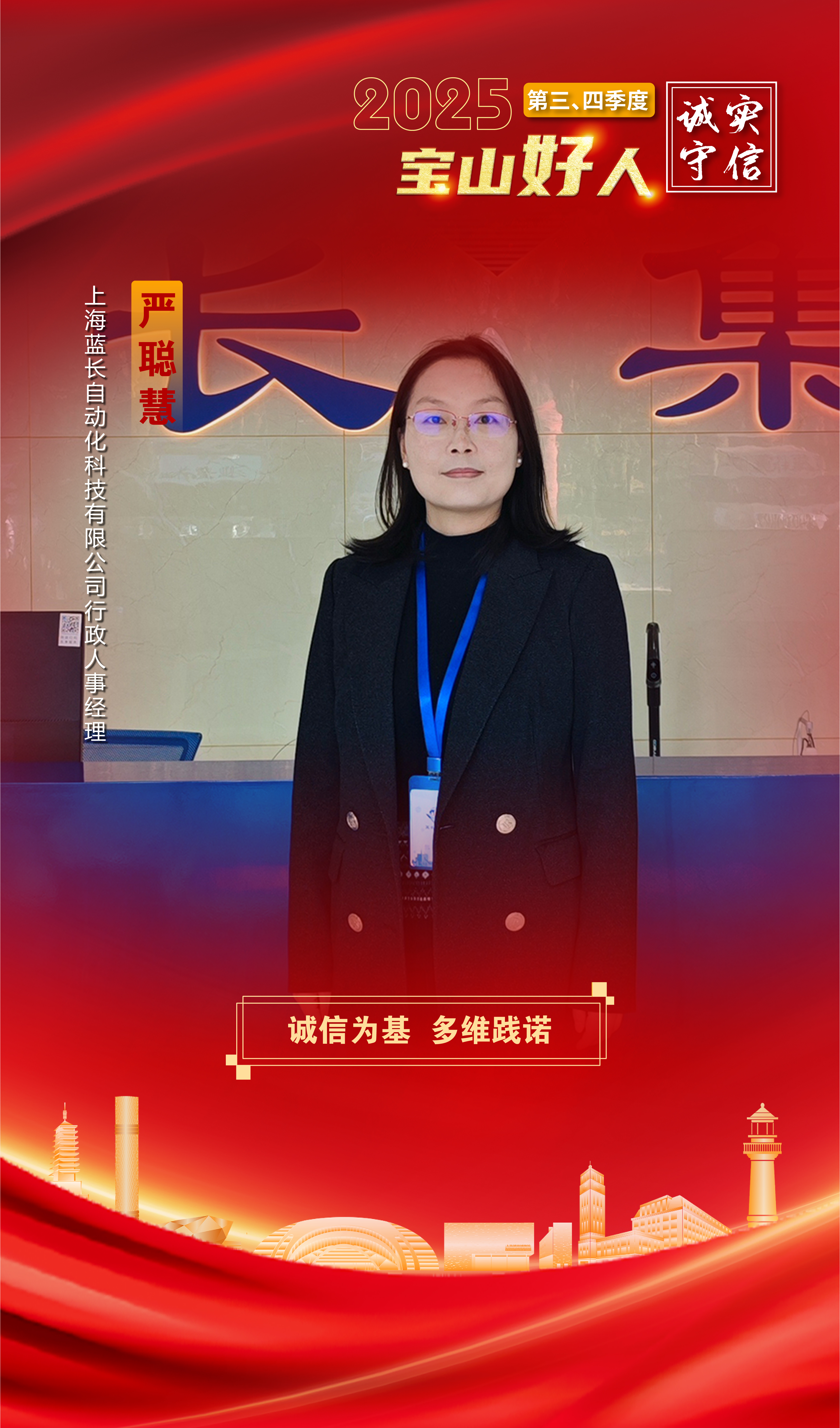 严聪慧,女,1986年7月生,上海蓝长自动化科技有限公司行政人事经理兼党支部书记,曾获“宝山区优秀人才工作联络员”荣誉称号。她扎根企业综合管理岗位20年,始终以“诚信为基”,在环评、资质、政策、人才等多领域践行承诺。作为环评负责人,她统筹危险废物管理、废气噪声检测、应急预案编制及排污许可证办理,确保全流程合规处置;在资质认证中,坚持“数据不造假、承诺必兑现”,主导通过ISO9001、14001、45001三大体系认证,推动企业获CCEP、ROHS、REACH、CE等数十类国内外产品检测认证。政府项目申报时,她严格审核材料真实性,成功申报上海市“专精特新”中小企业、上海市科技小巨人培育工程等15项,材料均通过主管部门“零质疑”审核。人才培育方面,她创新构建“引-育-留”全链条服务体系,累计办理人才落户14人、积分落户5人,居住证积分办理12人,推动设立8个产学研基地,培养清华、中科院等高校博士硕士30人,落实人才公寓补贴3人。她以点滴诚信之举,汇聚成推动企业高质量发展的磅礴力量,成为新时代企业建设者诚信履职的生动楷模。