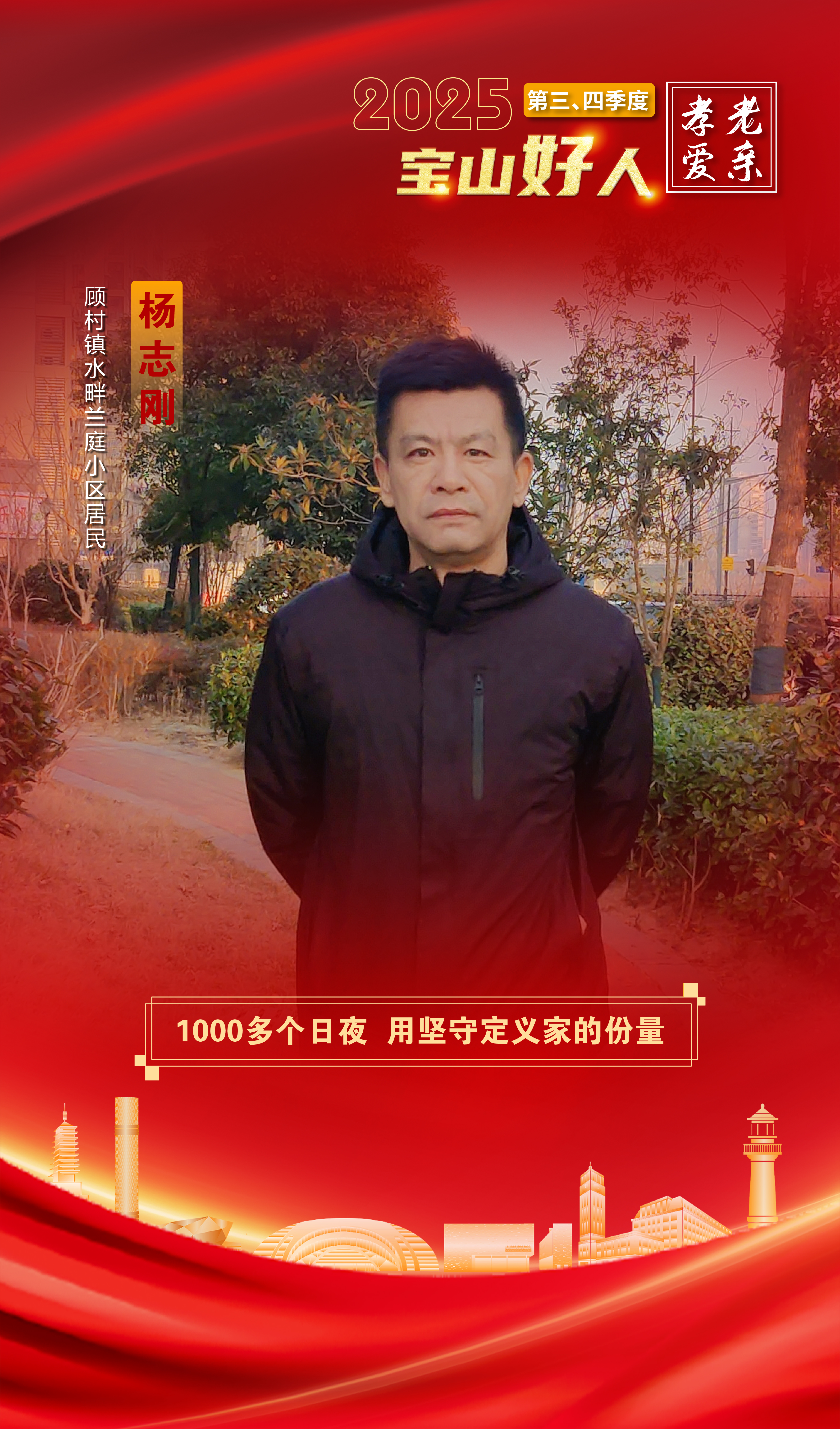 杨志刚,男,1974年4月生,家住顾村镇水畔兰庭小区。2022年夏,杨志刚遭遇人生重创:弟弟与80岁老父相继被确诊肺癌、前列腺癌晚期。握着两张沉甸甸的诊断书,杨志刚毅然辞去工作,拿出多年积蓄为父亲和弟弟治疗。面对每日近千元的治疗费用和病榻上日益虚弱的亲人,他没有退缩,默默承担起照顾家庭的责任,这一担,就是整整三年。三年过去,父亲的病情持续恶化,癌细胞已经扩散至腰椎,瘫痪在床且无法自理。弟弟癌细胞侵入脑髓,175厘米的身躯瘦至90斤,连起身都成奢望。每天凌晨五点至深夜,杨志刚在肿瘤医院走廊里穿梭,为瘫痪的父亲清理排泄物、喂营养餐,扶骨瘦如柴的弟弟接受治疗,并在病床前陪伴弟弟输液监护、疼痛护理,用精准到分钟的时间管理守护着至亲的生命。尽管杨志刚日夜照料,2025年8月弟弟最终仍因病情过重离世。此后,他将全部心力倾注在年迈的父亲身上。他三年如一日地坚持这份作息,只有深夜才得空喘息片刻。当被问及坚持的动力,他摩挲着洗得发白的衣服,憨厚作答:“他们在,家就在。”