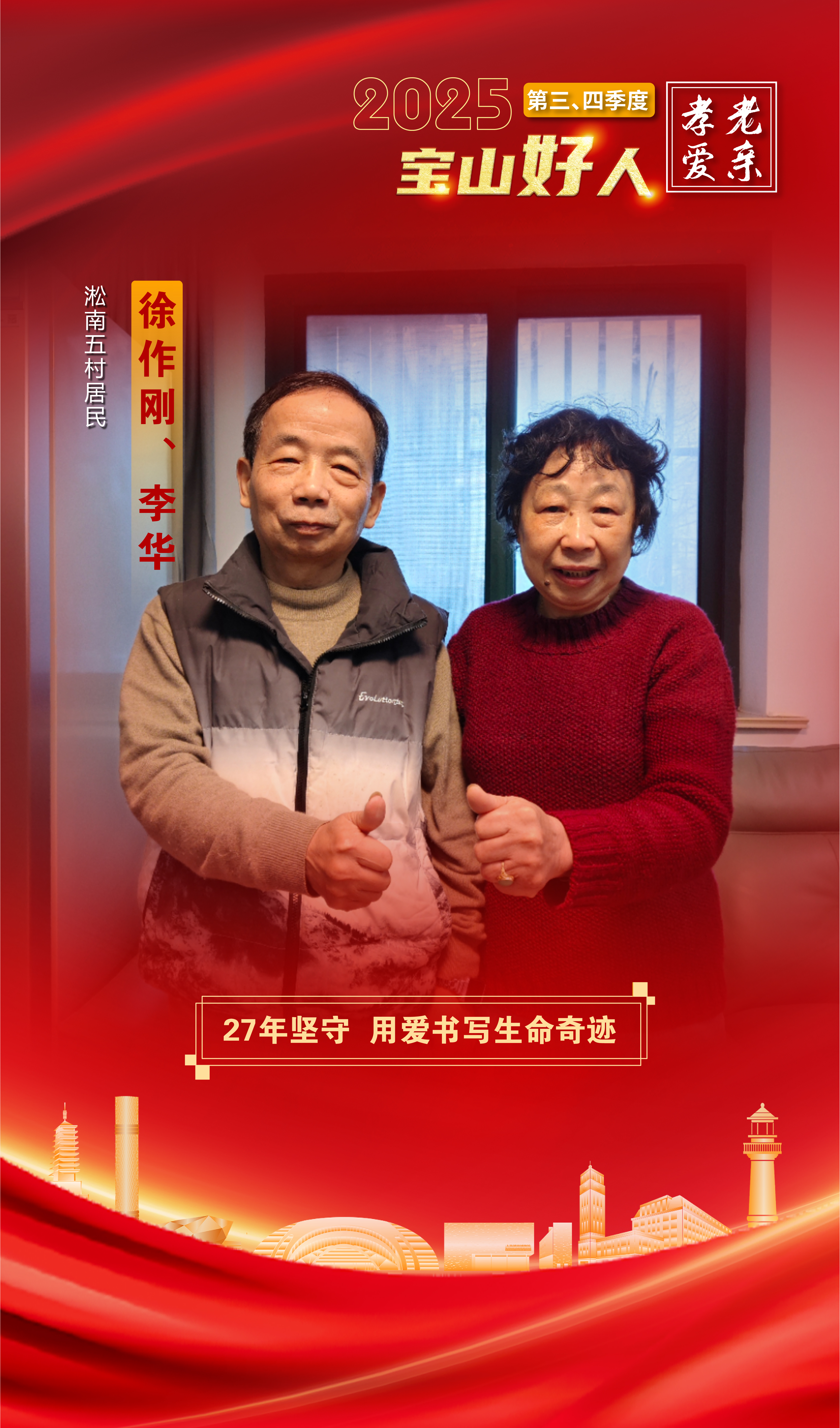 徐作刚,男,1956年1月生;李华,女,1958年3月生,淞南五村居民。夫妻二人都是码头退休工人,27年来,他们以超越常人的坚韧和深沉的爱,悉心照料罹患严重进行性肌营养不良症的儿子,创造了打破医生“活不过18岁”预言的生命奇迹。面对儿子自幼发病、逐渐丧失行动能力直至生活完全不能自理的残酷现实,夫妇俩从未放弃。他们轮班守护,日夜为儿子翻身、吸痰、按摩,无微不至。在父母无条件的爱与支持下,儿子虽因病痛被迫中断学业,却始终积极面对生活。机缘巧合,在一名罹患同样病症的大学教授的引领和帮助下,他通过刻苦学习掌握了计算机和外语知识,并创建个人公众号,撰写192篇原创文章,记录抗病历程,鼓舞了众多病友,阅读量超万次。在含辛茹苦照顾儿子的同时,夫妇俩还侍奉年迈母亲直至终老。他们心怀感恩,徐作刚主动担任社区楼组长,热心服务邻里,回馈社区和邻里的关心帮助。徐作刚和李华夫妇用27年的实际行动,为儿子小飞的生命撑起了一片充满温情和希望的天空。